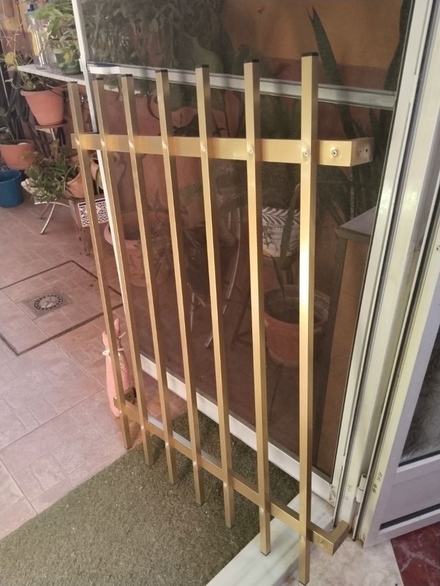 Reja de aluminio con un elegante acabado en color oro, diseñada para ventanas. 60 x 120 cm - Material: Aluminio. - Color: Oro.