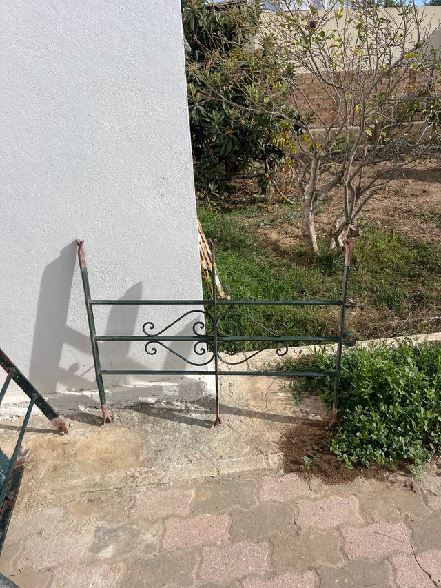 Reja de forja con un diseño ornamental. - Estructura de metal. - Acabado en color verde oscuro.