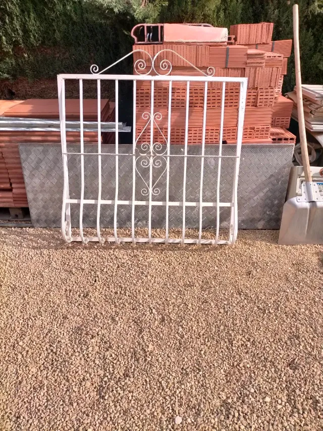 Reja de forja blanca para ventana. Diseño clásico con adornos.