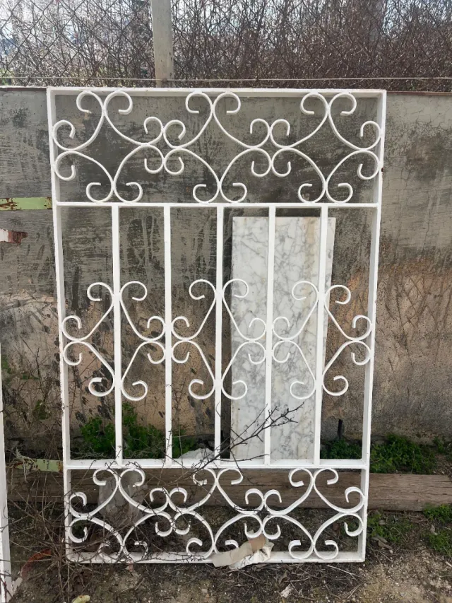 Reja de hierro forjado con un diseño ornamental. Medidas: 120×80 - Estructura blanca. - Motivos curvos y barrotes verticales.