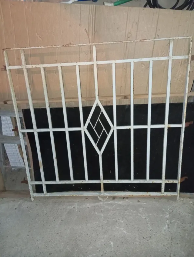 Detalles del productoReja de metal para ventana. Cuenta con un diseño de barrotes verticales y un detalle central en forma de rombo.