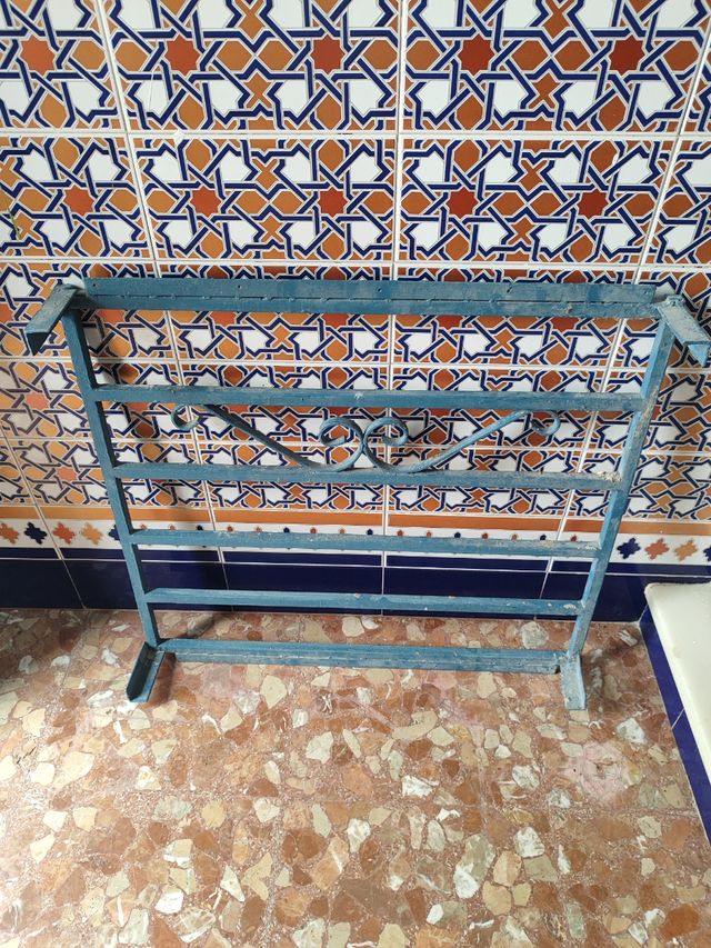 Reja metálica de color azul con un diseño decorativo en la parte superior. - Estructura de metal. - Diseño con volutas centrales. - Base estable.