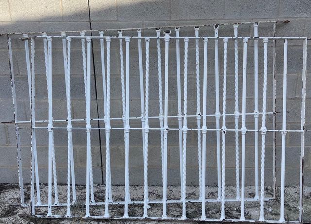 Reja de hierro macizo con barrotes retorcidos y detalles decorativos. - Material: Hierro macizo. - Diseño: Barrotes retorcidos y remates superiores. - Color: Blanco.