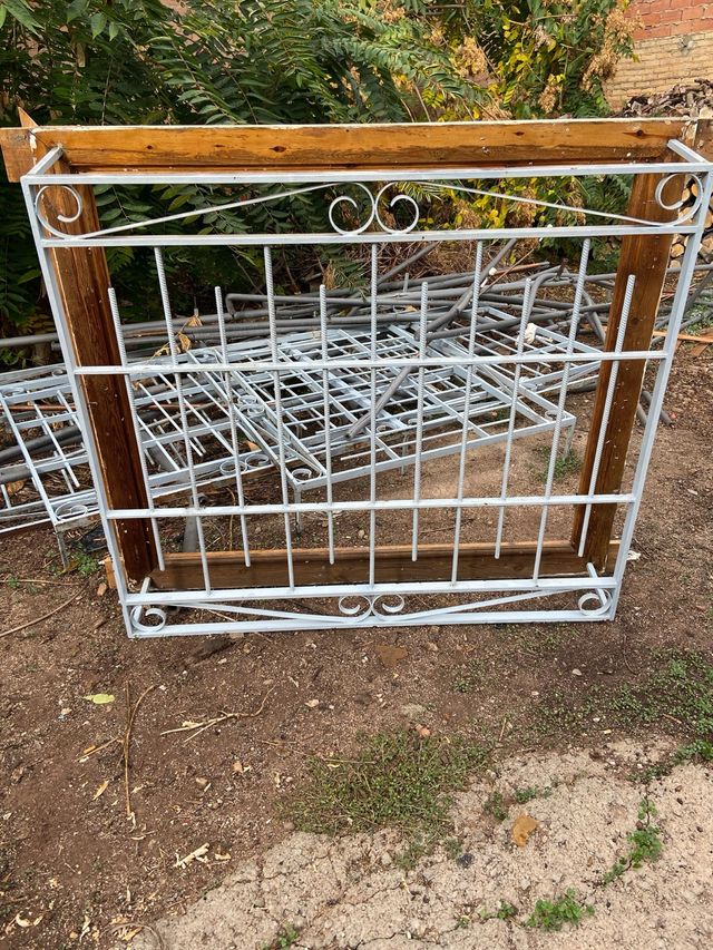 Detalles del productoConjunto de rejas de hierro forjado para ventanas. Tienen un diseño decorativo con volutas.
