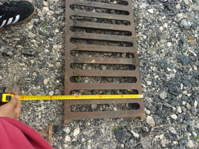 Rejilla metálica de desagüe, ideal para exteriores. - Material: Hierro fundido. - Diseño de barras. - Medidas aproximadas: 50 cm de largo.65x35 tengo unos 10 m