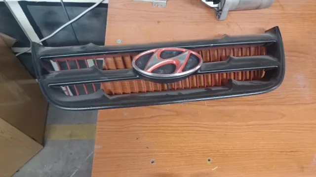 Rejilla frontal para Hyundai Matrix. Presenta el logo de la marca en el centro. - Diseño con barras horizontales. - Detalle en color rojo en las barras.