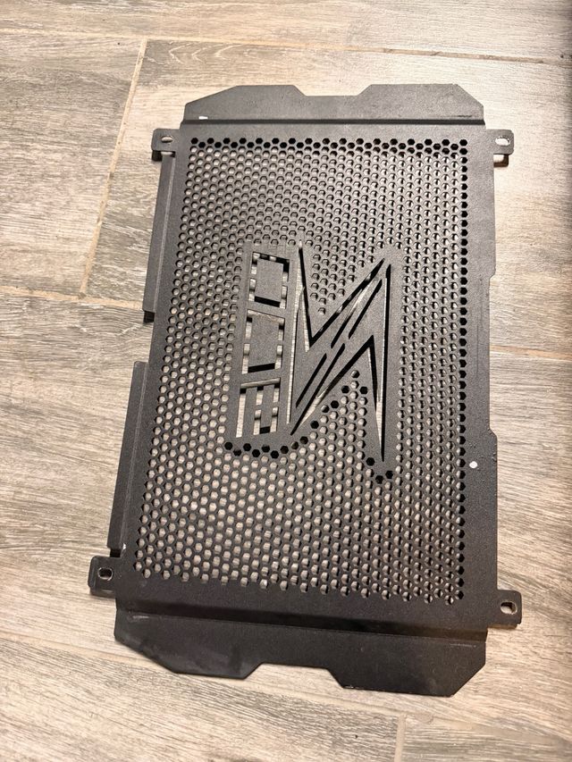 Rejilla protectora para el radiador de una Kawasaki Z900. Fabricada en metal con un diseño troquelado. - Diseño con logo. - Acabado en negro.