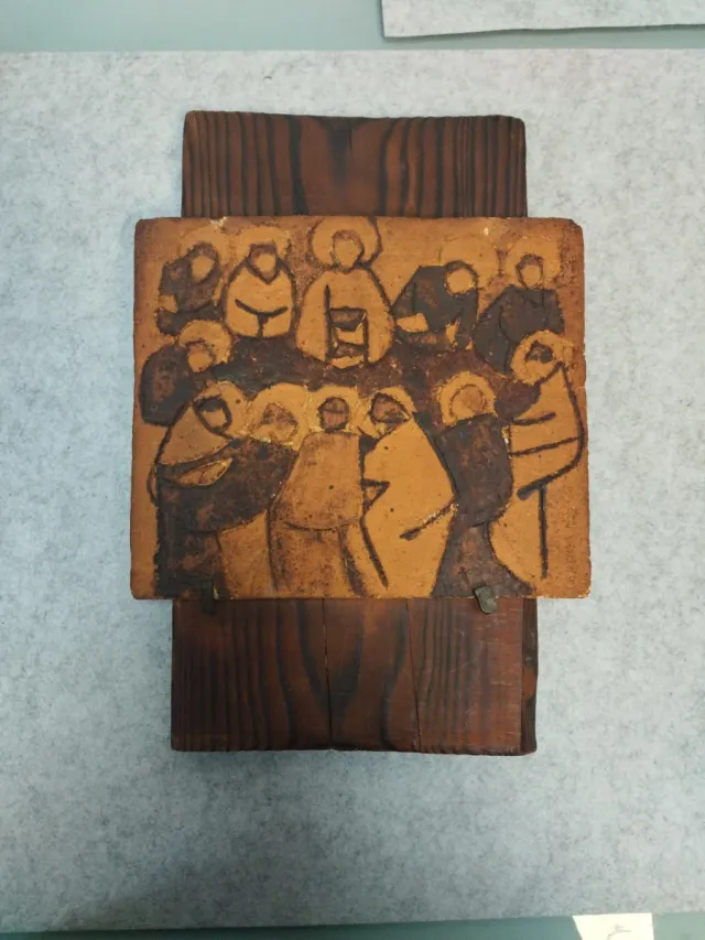 Vendo una pieza decorativa antigua compuesta por un relieve en cerámica de pasta rústica (barro grueso) montado sobre una tabla de madera. El motivo representa la escena cristiana de La Última Cena. La pieza tiene un carácter artesanal y un aspecto envejecido que le da presencia y autenticidad.