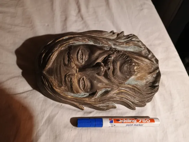 Detalles del productoDetalle de un relieve de Jesucristo, con un acabado que simula bronce y toques verdosos.
