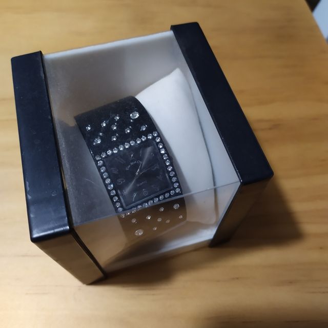 Reloj negro con pulsera piedras brillantes. Le falta la pila.
