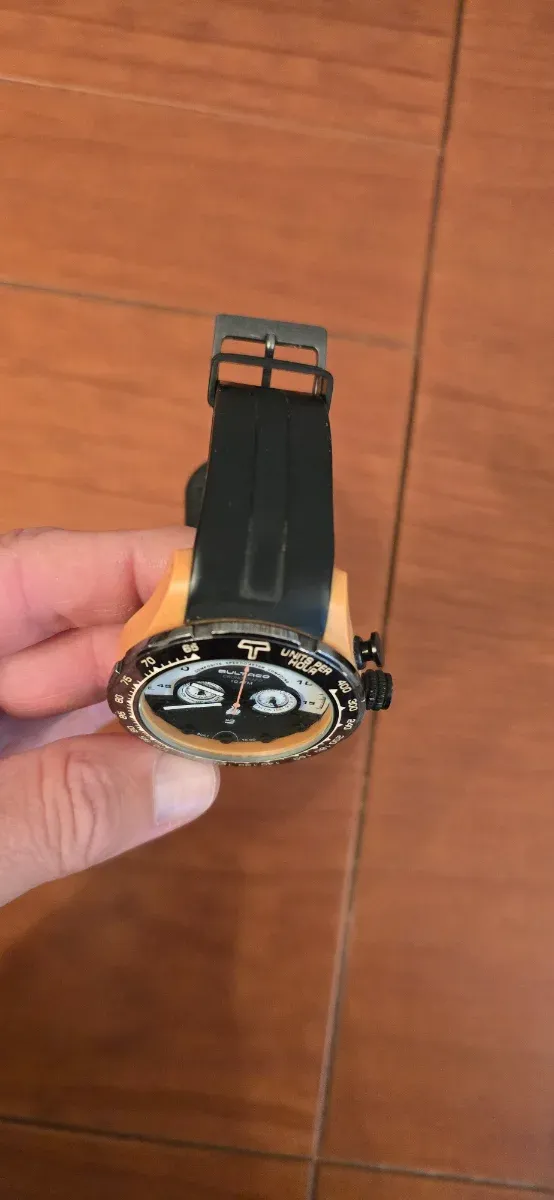 Detalles del productoReloj de pulsera Bultaco con correa negra y detalles naranjas.