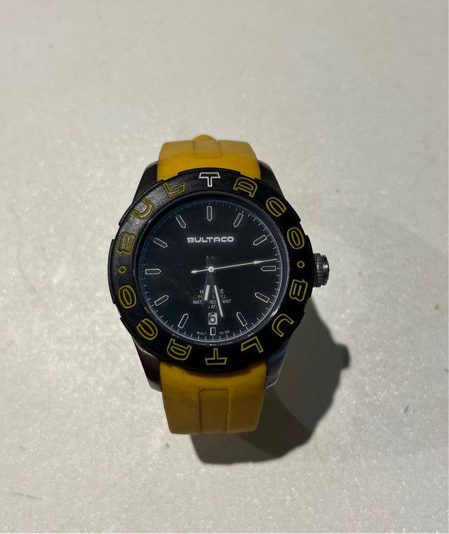 Detalles del productoReloj de pulsera Bultaco con correa de goma amarilla y detalles negros.