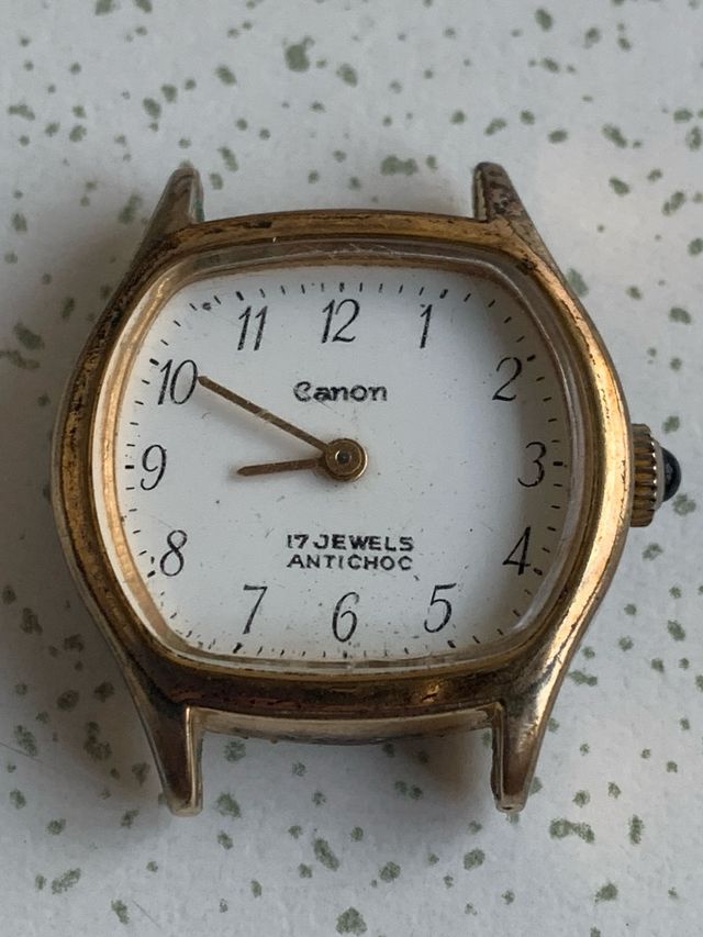 Detalles del productoReloj de señora Canon antiguo. Es de color dorado y tiene una estética clásica y elegante.