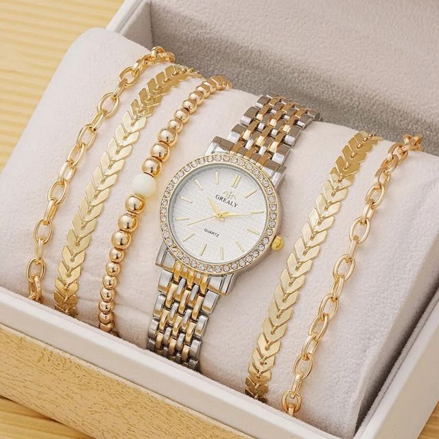 ✅️Reloj cuarzo mujer con 5 pulseras color oro