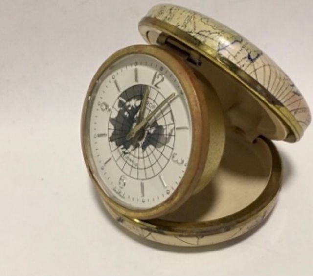 Este reloj de viaje de cuerda presenta un diseño único con un diseño del mapa del mundo.