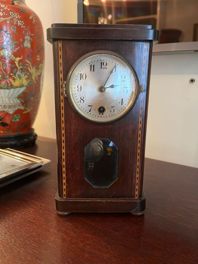 Detalles del productoElegante reloj de mesa antiguo con una caja de madera oscura y detalles decorativos en los laterales. Presenta una esfera redonda con números romanos y manecillas finas.