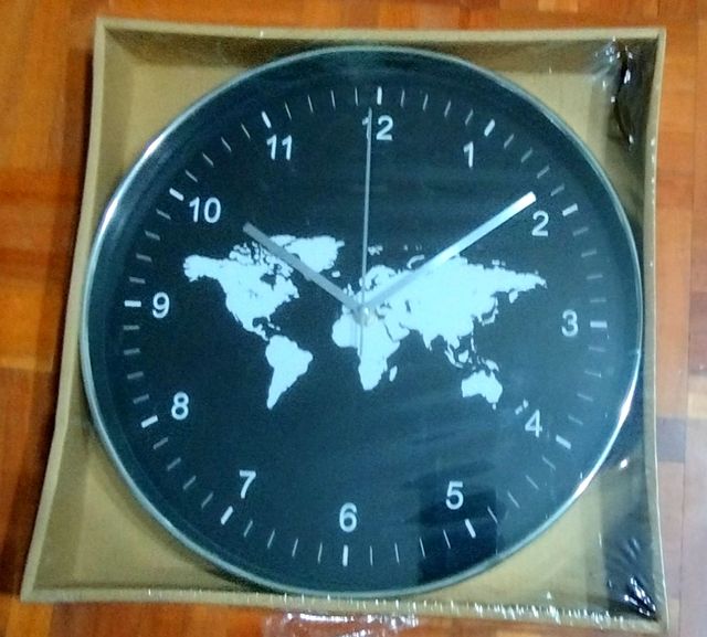 Detalles del productoNO SE HACEB REBAJAS.reloj de pared con mapa mundo banco esfera en negro, y marco plateado. nuevo a estrenar en su embalaje original,medidas 30x30 no se admiten devoluciones en este tipo de artículos si compra este artículo acepta las condiciones de compra.