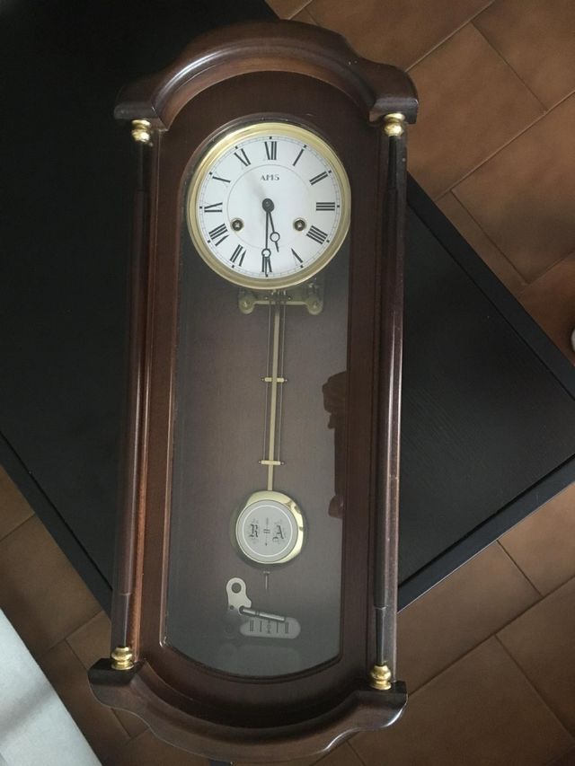 Detalles del productoElegante reloj de pared AMS con mecanismo de cuerda y péndulo.