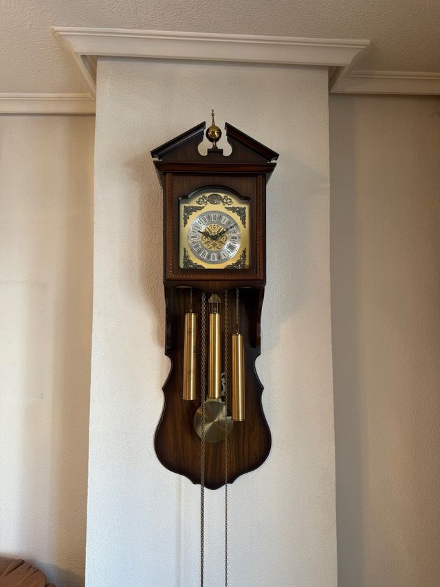 Buen estadoDetalles del productoReloj de pared mecánico tradicional con péndulo y 3 pesas de latón.