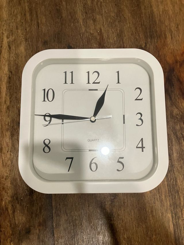 Reloj de pared con un diseño moderno y minimalista. - Marco de color blanco. - Esfera cuadrada con números negros.