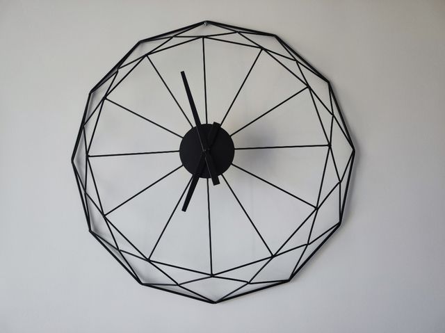 Elegante reloj de pared con un diseño geométrico moderno. - Estructura de alambre negro. - Diseño abierto y ligero.