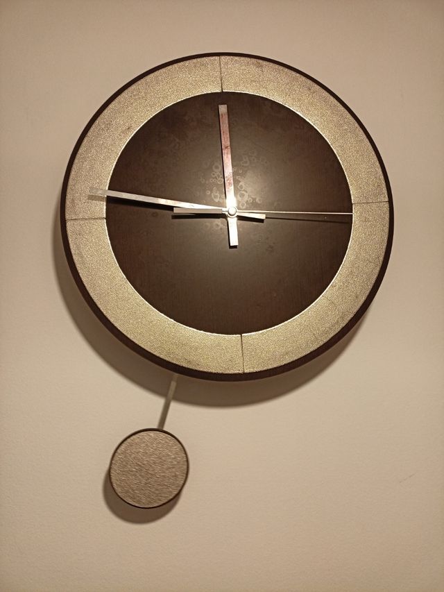 Detalles del productoBonito reloj de pared con pendulo un diseño moderno y elegante. Su tamaño lo hace ideal para cualquier estancia.