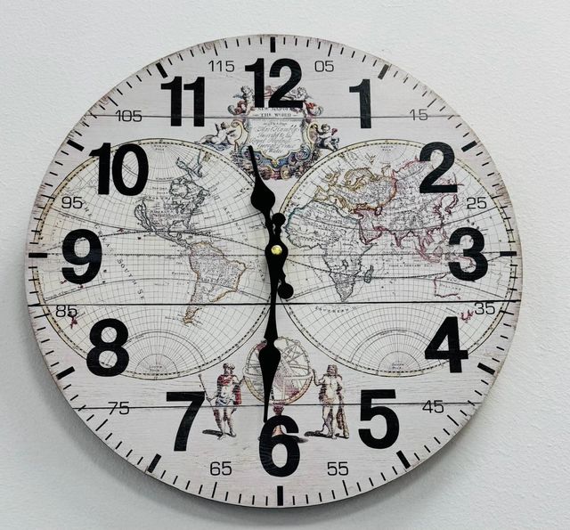 Detalles del productoReloj de pared con un diseño de mapa del mundo vintage.