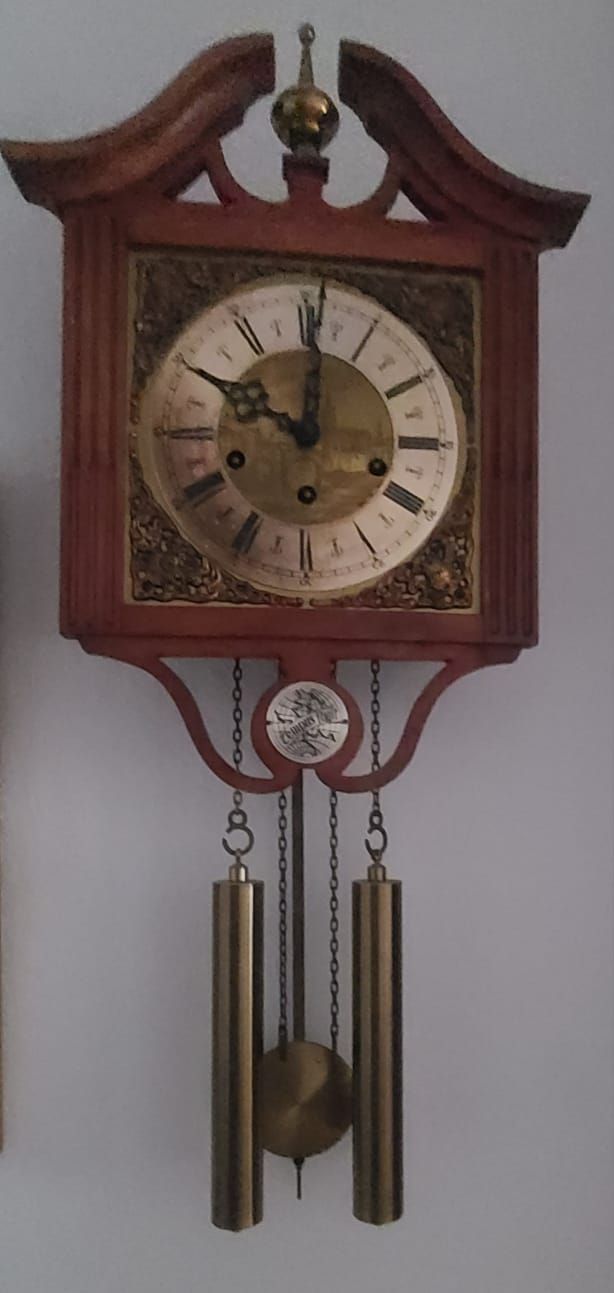 Elegante reloj de pared con caja de madera y detalles en latón. Su diseño clásico lo hace perfecto para cualquier hogar.