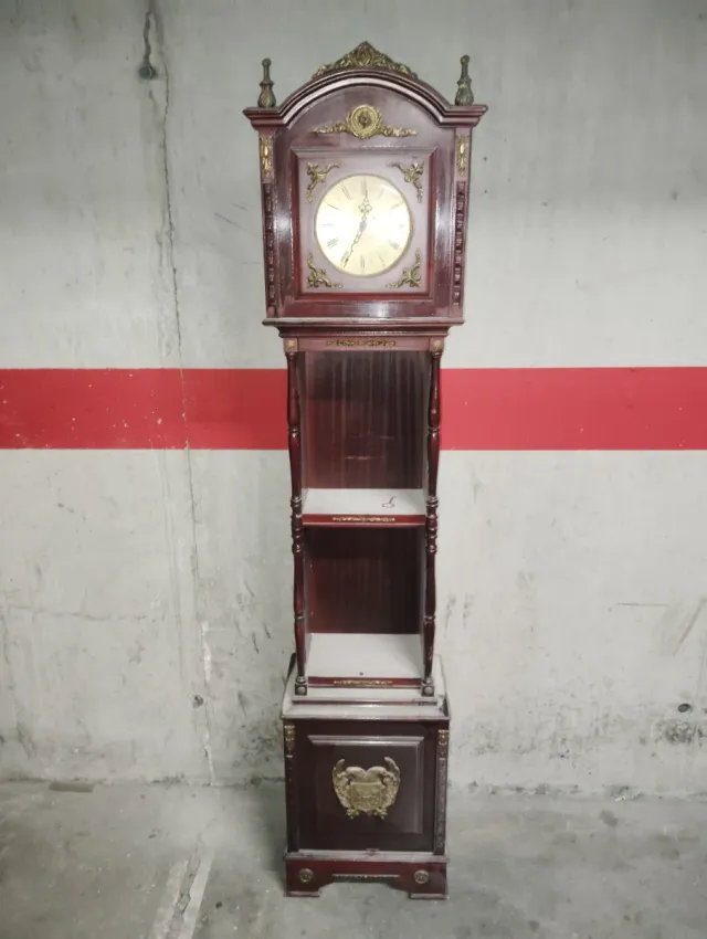 Detalles del productoElegante reloj de pie de madera oscura con detalles dorados. Su diseño clásico lo convierte en una pieza decorativa.