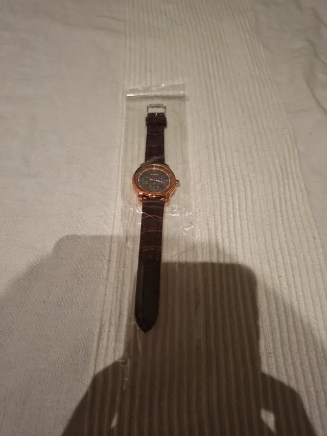 Elegante reloj de pulsera con un diseño clásico. - Correa de cuero marrón. - Esfera redonda con detalles.