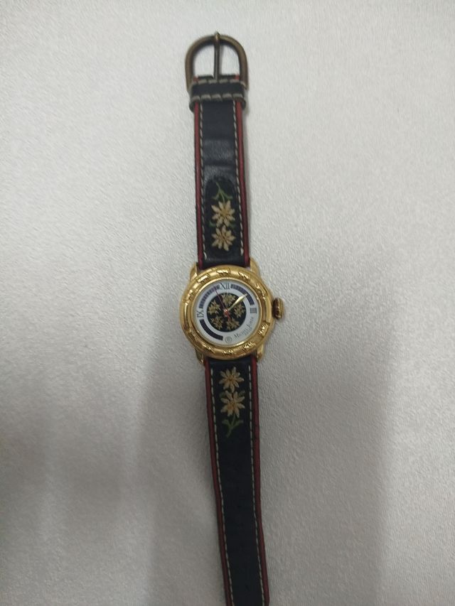Detalles del productoElegante reloj de pulsera con correa de cuero negra y detalles bordados de flores.