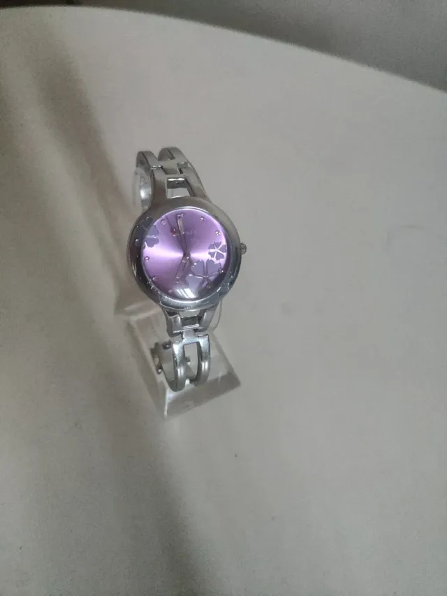 Reloj de pulsera plateado con la esfera morada