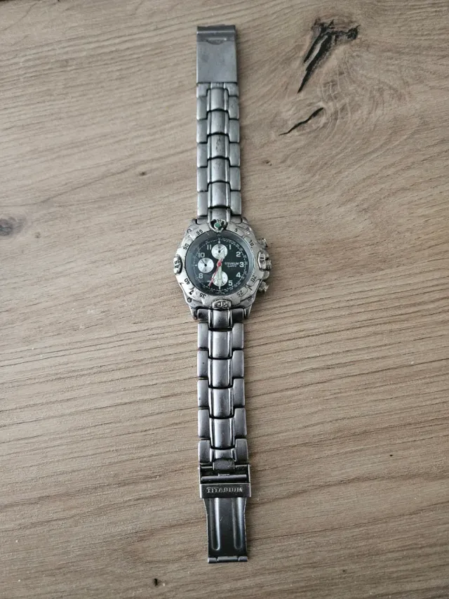 Reloj de pulsera con correa de eslabones y detalles en negro.mucho tienpo parado - Material: Titanio. - Cierre de seguridad.