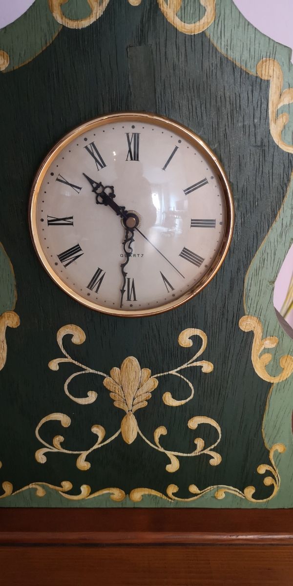 Reloj de sobremesa con caja de madera pintado a mano. El mecanismo funciona sólo con una pila pequeña. Buen estado.