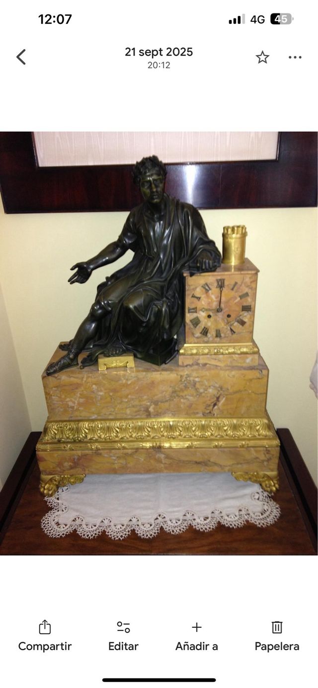 Elegante reloj de sobremesa de estilo antiguo, con una figura decorativa. - Base de mármol veteado. - Detalles dorados ornamentados. - Figura de bronce.