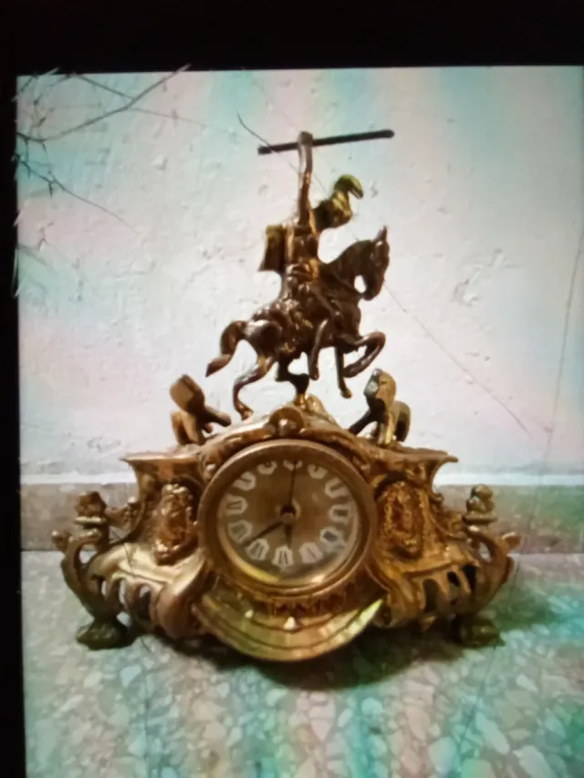 Elegante reloj de sobremesa con una figura de jinete y caballo. Es de bronce y no funciona, habría que arreglar el mecanismo - Material: Bronce. - Diseño ornamentado.