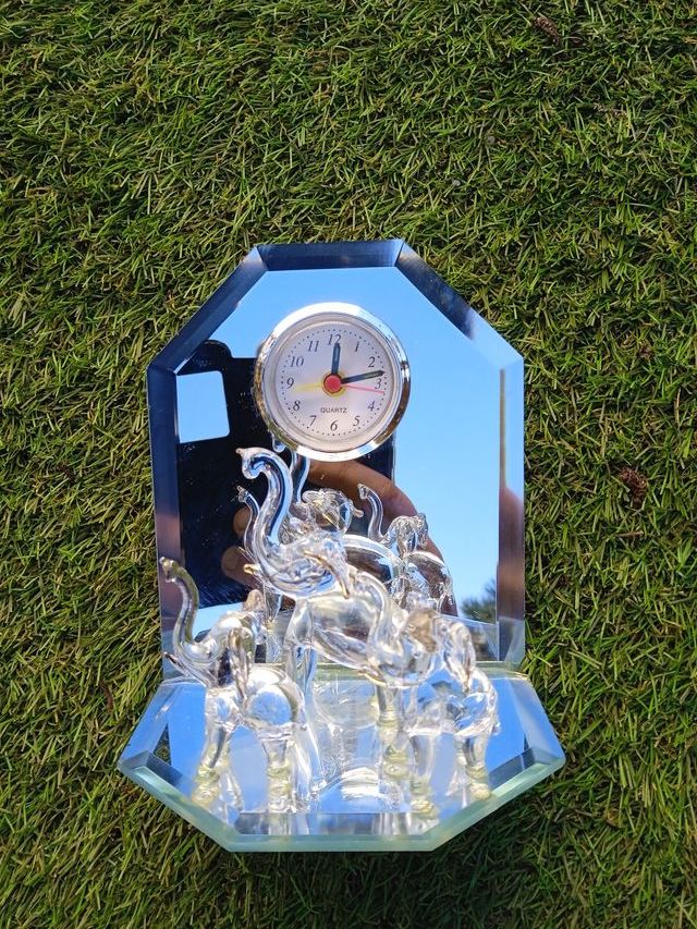 Elegante reloj de sobremesa con base de cristal y figuras de elefantes. - Diseño detallado de elefantes. - Marco del reloj plateado. - Base facetada de cristal.
