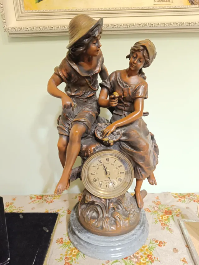 Precioso reloj de sobremesa con figuras pastorales. - Diseño clásico y elegante. - Figuras detalladas de estilo pastoral. - Base de mármol.