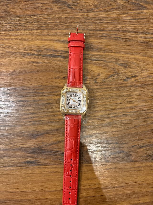 Reloj dorado con correa roja