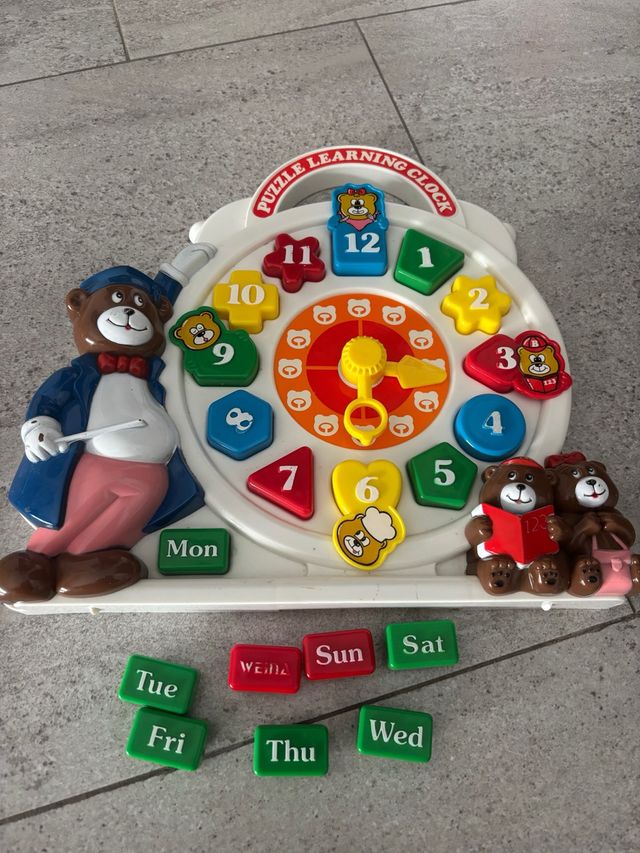 Detalles del productoReloj interactivo de aprendizaje para niños, con diseño de ositos y números.