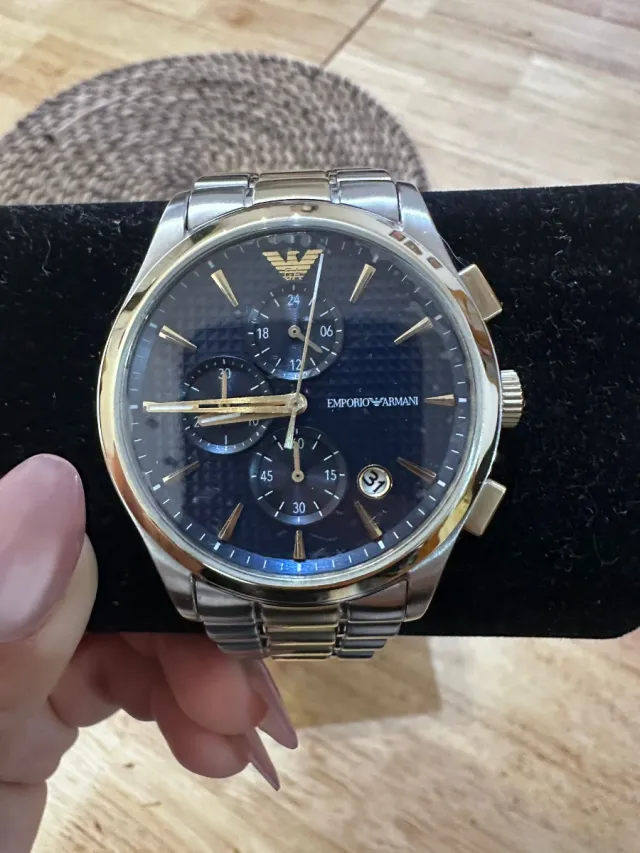 Elegante reloj Emporio Armani con esfera azul y detalles dorados.