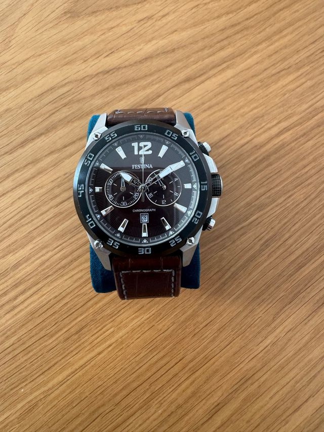 Elegante reloj Festina con correa de cuero marrón y detalles plateados.