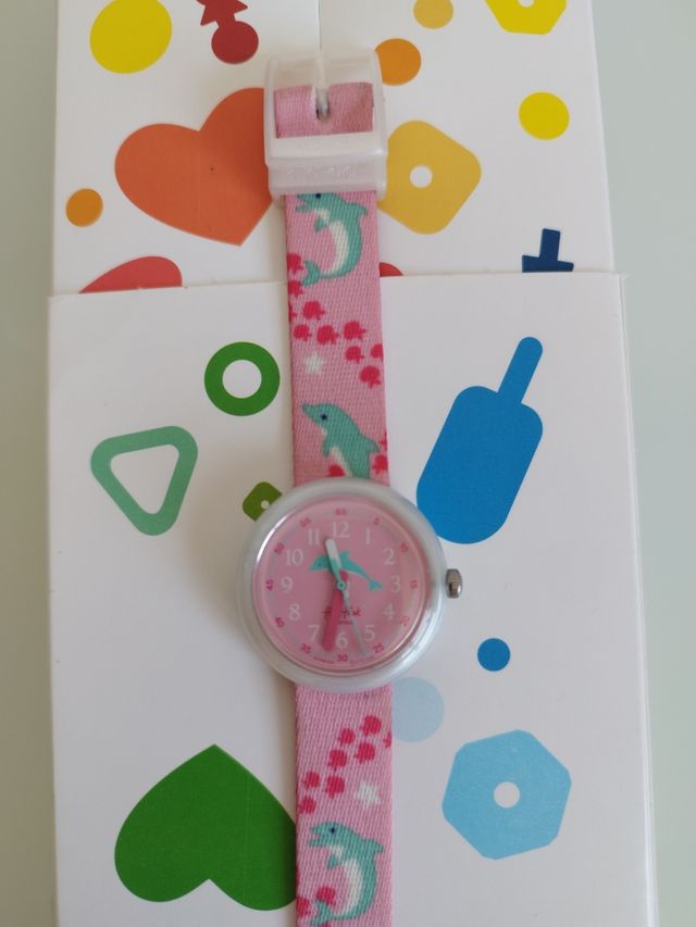 Detalles del productoReloj Flik Flak para niñas y niños, ideal para aprender a decir la hora. Tiene una bonita correa de tela de color rosa con delfines y una esfera rosa clara.