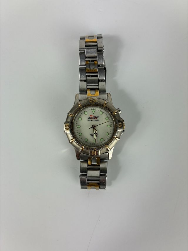 Reloj Freestyle Night Vision estilo diver con caja y brazalete de acero inoxidable bicolor (acero y dorado). Esfera clara con índices luminiscentes y resistencia al agua 100 m. Movimiento cuarzo japonés. Estética retro muy característica de los 90. Presenta marcas normales de uso, pero funciona correctamente.