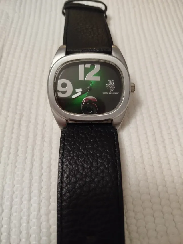 Reloj de pulsera con correa de cuero negra y esfera verde. - Diseño moderno. - Correa de cuero. - Esfera de color verde.
