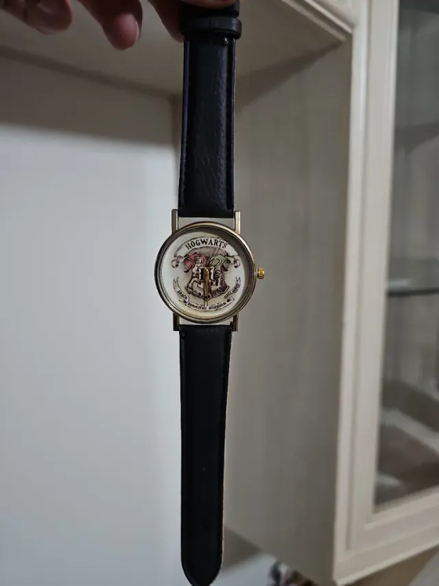 Reloj con diseño de Harry Potter y el escudo de Hogwarts. - Correa de cuero negra. - Detalles dorados en la caja.