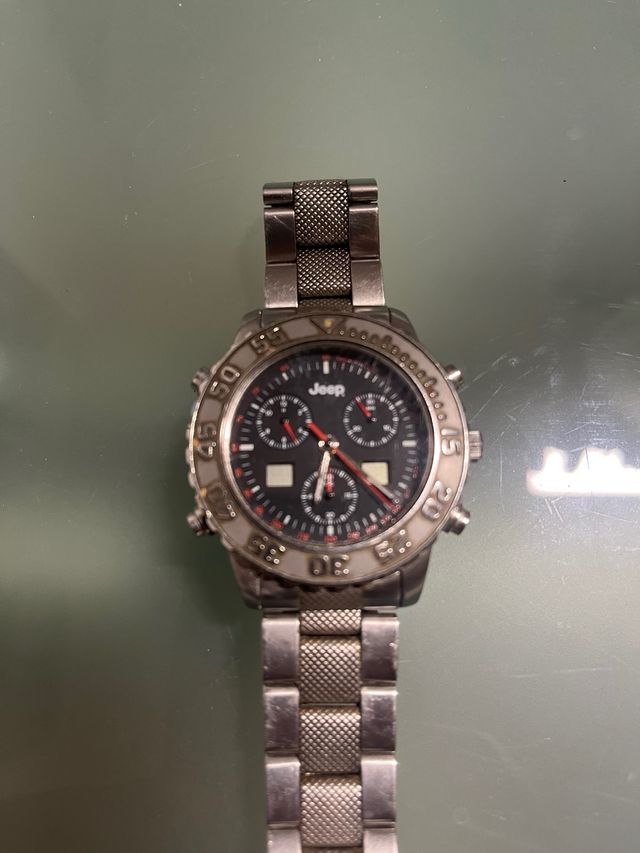 Reloj de pulsera Jeep con diseño deportivo y esfera negra. - Caja y brazalete de acero inoxidable. - Bisel giratorio con marcadores. - Tres subesferas para cronógrafo.