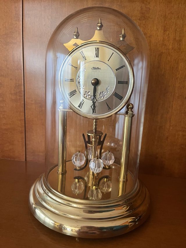 Detalles del productoElegante reloj de sobremesa Kaller con movimiento Quartz y una altura aproximada de 30cm. Su diseño se realza con una cúpula de cristal que protege la esfera y el péndulo.