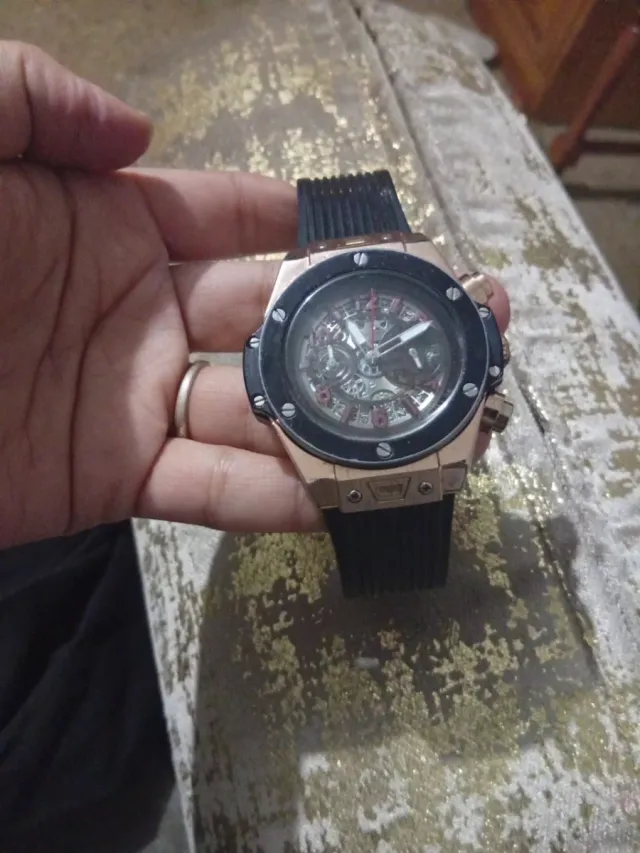 Reloj kimsdun de pulsera con diseño moderno. - Correa de caucho negra. - Caja de metal con acabado dorado. - Esfera con detalles mecánicos visibles.