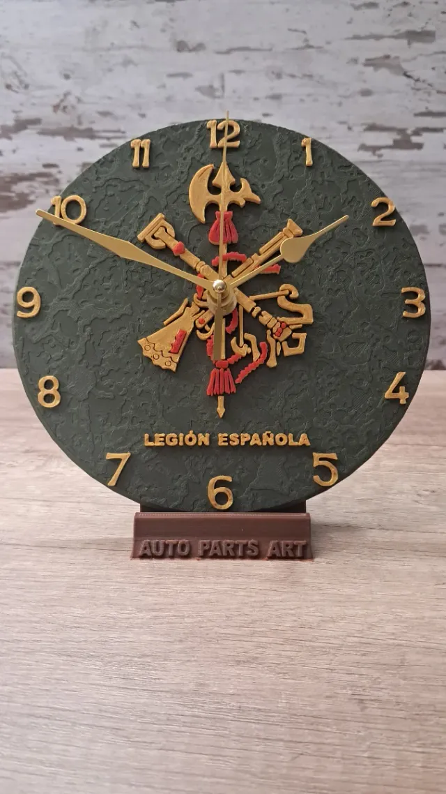 Detalles del productoReloj Legión Española, 20cm de diámetro aprox., mecanismo silencioso y segundero de movimiento continuo. Con peana para sobremesa y gancho trasero para colgar en la pared.